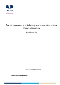 Tämän opinnäytetyön aihe on Social commerce - Kuluttajien kiinnostus ostaa some-kanavista. Sosiaalisesta mediasta suoraan ostaminen on varsin uusi ilmiö ja työssä selvitetään kiinnostaako kuluttajia ostaa suoraan sosiaalisen median kanavista. Sosiaalisen median kanavat rajattiin Facebookiin, Instagramiin ja Pinterestiin. Kuluttajien kiinnostusta ostaa some-kanavista selvitettiin laadullisen tutkimuksen menetelmin, joita olivat teemahaastattelu sekä havainnointi. Tutkimuksessa selvitettiin syitä, miksi kuluttaja ostaa sosiaalisen median kanavista, mitä kuluttaja ostaa kanavista, miten kuluttaja ostaa sekä mitkä tekijät saavat kuluttajan epäröimään ostopäätöstään. Työssä selvitettiin myös onko kanavalla vaikutusta ostopäätöksen tekemiseen.