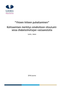 Tämä opinnäytyö tuotti tietoa diabetesta sairastavan ihmisen hoitoon sitoutumisesta. Hoitoon sitoutuminen koostui monista elementeistä, joita tulee tarkastella laajemmin pohdittaessa diabetesta sairastavien ihmisten sitoutumista omahoitoon. Hoidonohjauksen asiantuntijuus sisälsi ammattitaidon, opettamisen ja ohjaamisen. Asiantuntijuus ja yksilöllisyys liimaantuivat yhteen eettisen herkkyyden avulla kohdatessa diabetesta sairastava ihminen vuorovaikutussuhteessa. Diabetesta sairastavan ihmisen kohtaaminen oli se elementti, missä mahdollistui hänen sitoutuminen omahoitoon asiantuntijan tuella. Positiivisella asenteella hoidonohjauksessa onnistuttiin luomaan ”hyvä tunnejälki”, missä luotiin pohjaa omahoitoon sitoutumiselle.