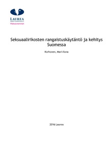 Opinnäytetyön tarkoituksena on osoittaa, että tuomioistuimien määräämät rangaistukset seksuaalirikoksista ovat yleisesti lieviä. Työssä oikeuskäytäntöä tarkastellaan pääsääntöisesti korkeimman oikeuden tapausten valossa. Merkittävimpinä lähteinä työssä on käytetty korkeimman oikeuden tapausten lisäksi lain esitöitä eli hallituksen esityksiä ja kansainvälisiä sopimuksia sekä kansainvälisiä oikeustapauksia.
