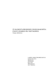 Tässä opinnäytetyössä tarkastellaan pk-yritysten IT-hankintaprosessia ostajien näkökulmasta. Opinnäytetyössä käsitellään päijäthämäläisten pk-yritysten IT-vastaavien haastatteluissa esiin tullutta laadullista tietoa pk-yritysten IT-hankintaprosessiin vaikuttavista tekijöistä. Tavoitteena on kartoittaa erityisesti millaisista vaiheista pk-yritysten IT-hankintaprosessi koostuu ja millaisia ongelmia prosessissa kohdataan. Aiheeseen syvennytään pk-yritysten IT-hankintaprosessiin liittyvien lähde-aineistojen sekä oppiva organisaatio -teorian kautta. Opinnäytetyössä esitellään näkemyksiä IT-hankintaprosessin vaiheistuksesta sekä selvitetään yrityksen mahdollisuuksia oppia prosessiin liittyvistä ongelmista ja keinoja onnistua välttämään ne tulevaisuudessa. Empiirinen tutkimus suoritettiin laadullisina teemahaastatteluina seitsemässä päijäthämäläisessä pk-yrityksessä. Vastaajina toimivat yritysten IT-hankinnoista vastaavat henkilöt. Kohderyhmä rajattiin pk-yrityksiin, joiden IT-hankinta-päätökset tehdään Päijät-Hämeen alueella ja joiden viimeisimmästä IT-järjestelmä, -ohjelmisto tai -palveluhankinnasta on kulunut alle kaksi vuotta. Tutkimustuloksista nousi esiin, että päijäthämäläisten pk-yritysten IT-hankinta-prosessissa esiintyy hyvin samankaltaisia ongelmia. Nämä voidaan jakaa ostajasta tai toimittajasta johtuviin ongelmiin sekä alueellisen tarjonnan ongelmiin. Suu-rimmat prosessin ongelmat liittyvät myyjä-asiakassuhteen osapuolten väliseen puutteelliseen viestintään. Myös alueellinen tarjonta koettiin osaltaan sopimattomaksi pk-yritysten tarpeisiin.