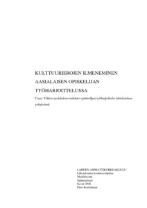 Tämä opinnäytetyö käsittelee Suomen ja Aasian välillä vallitsevia eroja työssä. Aineiston avulla on selvitetty, miten kulttuurierot ovat ilmenneet Lahden ammattikorkeakoulun liiketalouden laitoksen aasialaisten opiskelijoiden työharjoittelussa paikallisissa yrityksissä. Lisäksi on mietitty kulttuurierojen seurauksia ja syitä. Teoriaosassa selvitetään kulttuuri-, kulttuurikarttamalli-, kulttuuriero- ja työkulttuuri- käsitteitä. Lisäksi on aihetta käsittelevän tutkimuskirjallisuuden pohjalta mietitty Suomen ja Aasian välillä vallitsevia eroja työelämässä. Kulttuuri sisältää arkielämän kirjoittamattomia sääntöjä ja tapoja toimia, ajatella, tuntea sekä reagoida. Se on myös elämäntapa. Eri kulttuurin piirteillä yhteisöt erottuvat toisistaan. Kulttuurieroissa esiintyy yhtäläisyyksiä kulttuurikäsitteen kanssa. Eroja ilmenee, koska ihmisryhmät kehittävät erilaisia arvoja ja peruskonsepteja heitä ympäröivän maailman ymmärtämiseen ja heidän toimintansa opastamiseen. Opinnäytetyön empiriaosuus koostuu aasialaisilla tutkinto-opiskelijoilla ja paikallisilla yrityksillä teetetyistä avoimista haastatteluista. Tavoitteena on ollut selvittää kulttuurieroja ja niiden ilmenemistä työharjoittelussa sekä opiskelijoiden että yritysten näkökulmasta. Aineiston perusteella voidaan todeta, että kulttuurieroja tunnistetaan, mutta niitä ei koeta haittatekijöiksi. Suurimmat kulttuurierot ovat esimiehen kunnioittamisessa, kommunikoinnissa ja aikakäsityksessä. Esimiehen kunnioitus korostuu enemmän Aasiassa. Tämä ilmenee muun muassa siten, että esimiestä kohdellaan arvokkaammin ja eri tavalla kuin muita työntekijöitä. Aasian työelämä onkin hierarkkisempaa. Kommunikointi esiintyy muun muassa ryhmätyötaidoissa. Aasialaiset ovat yhteisöllisempiä. Aikakäsitys puolestaan ilmenee siten, että suomalaiset ovat aasialaisia täsmällisempiä. Tämän opinnäytetyön tuoma hyöty onkin, että opitaan ymmärtämään näitä kulttuurien välisiä eroavaisuuksia. Muutamista työharjoittelun markkinointia ja toteutusta koskevista mielipiteistä huolimatta sekä opiskelijat että työnantajat näyttävät suhtautuneen positiivisesti työharjoitteluun.