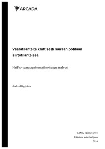Vaaratilanteita kriittisesti sairaan potilaan siirtotilanteissa : HaiPro-vaaratapahtumailmoitusten analyysi