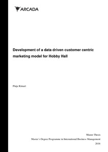 The present study had two aims. Firstly to create an understanding of how a Finnish re-tailer can move into a data driven customer centric marketing model. The research com-prised of literature studies and expert interviews of relevant marketing theories, best practices and legislative restrictions regarding personally identifiable data. And secondly to develop a first model for Hobby Hall based on the research. The model was evaluated by a focus group and further developed based on the feedback. The research focused on marketing strategies, Data driven marketing, and personalized marketing. Additionally the researcher studied the legislative perspective on personally identifiable data usage. The research did not include social media or banner advertising as marketing channels, but concentrated on Hobby Halls traditional channels; catalogue and e-mail. The research further out scoped technical aspects of the solutions. As a result a model was developed for Hobby Hall that creates a good base for the commissioner to plan for the future.