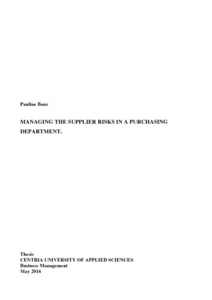 In a first place the theoretical part provides the context and the stakes that a purchasing department is confronted with when managing the risks, the evolution of this service and its central role in the man-agement of the supplier risks. One part highlights the different risks met by a purchasing department in general, going through the macro economical risks, the financial ones, then the industrial and quali-ty risks, to continue with the legal risks and those bound to the image and finally the human risks. The idea is to relate all possible risks to, in a third part, evoke the implementation of a methodology of risk management. At last, an integrated approach into the management process will lead to the different steps required to manage the supplier risks.