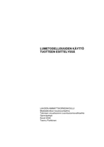 Opinnäytetyössä perehdytään lumetodellisuuden luomiseen sekä sen käyttöön tuot-teen esittelyssä. Työssä käydään läpi lumetodellisuuden yleisimpiä laitteistoja sekä kaksi eri ohjelmaa, joilla lumetodellisuutta voidaan rakentaa ja katsella. Tämän lisäksi selvitetään pintapuolisesti lumetodellisuuden ohjelmien tarvitsemia muita ohjelmia sekä käyttäjältä näkymättömissä toimivia apuohjelmia. Työn keskeisimpiin osa-alueisiin kuuluvat lumetodellisuuden tuottamiseen tarvittavien laitteistojen tutkiminen, ohjelmistojen toimintoihin tutustuminen sekä lopulta näiden kahden osa-alueen yhdistäminen rakennettaessa toimivaa kokonaisuutta lumetodel-lisuuden tuottamiseen. Lumetodellisuus käsitteenä on aina ollut vaikeaselkoinen. Tämän takia on tärkeä ymmärtää mitä lumetodellisuus oikeasti tarkoittaa, ennen kuin lähdetään tutkimaan lumetodellisuuden osa-alueita tarkemmin. Lumetodellisuuden käsite sekä historia ja vaatimukset käydään läpi työn alussa ennen muihin osiin syventymistä. Kun lumetodellisuus on käsitelty, syvennytään lumetodellisuuden näyttö-, ohjain-, paikannus sekä äänilaitteisiin. Näistä äänilaitteiden käsittely jätetään vähemmälle, koska niitä ei käytäntöosuudessa käsitellä lainkaan. Äänilaitteita ei kuitenkaan jätetty kokonaan pois työstä, koska ne liittyvät tiukasti lumetodellisuuteen. Opinnäytetyön kirjoittaminen perustui tietojen kokoamiseen Internetistä sekä tutkiel-mista löydettyihin teorioihin. Tämän lisäksi kirjoittajalla itsellään oli paljon tietoa lume-todellisuuden tekniikoista. Internet koettiin hyväksi lähteeksi, joka oli useimmiten pa-remmin ajan tasalla tietojen suhteen kuin esimerkiksi painetut teokset. Teoria osuus tehtiin kahdella ohjelmalla, joiden lopputuloksena tuotettiin kaksi erilais-ta ja erilaisilla toiminnoilla olevaa lumetodellisuustuote-esittelyä. Nämä kaksi lopputu-losta erosivat toisistaan niin paljon, ettei niiden välistä vertailua suoritettu kuin teoria-tasolla. Lumetodellisuuden käyttö tuotteen esittelyssä todettiin käyttökelpoiseksi ratkaisuksi. Se antaa mahdollisuuden huomattavasti monipuolisempaan tuote-esittelyyn kuin pe-rinteisillä tekniikoilla toteutettu vaihtoehto.