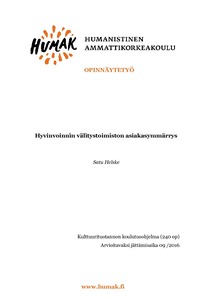 Tämä opinnäytetyö auttaa lukijaa hahmottamaan, mitä palvelumuotoilu on ja miten kulttuurituottaja voi hyödyntää sitä palveluiden suunnittelussa ja kehittämisessä sekä tässä tapauksessa kulttuuri-, sosiaali- ja terveysalalla. Opinnäytetyön tilaajana on Hyvinvoinnin välitystoimisto-hanke, jota koordinoi Humanis-tisen ammattikorkeakoulun TKI-keskus. Hyvinvoinnin välitystoimiston tavoitteena on kouluttaa, verkos-toida, tukea, neuvoa ja kehittää osallistavan taiteen kenttää ja yhdistää tarjontaa ja kysyntää.