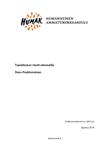 Opinnäytetyö selvittää tapahtumaviennin peruskäytäntöjä, vaiheita ja ketjuttamisen toimintamallin rakentamista lähdekirjallisuuteen, tutkimuksen tuomaan ja omakohtaiseen tietoperustaan nojaten. Työn aineistonhankinnassa käytettyjä menetelmiä ovat pilotointi, havainnointi, benchmarking, brains- torming ja ammattilaishaastattelut. Selvityksessä tutkitaan kulttuurin alalla vallitsevia festivaali- ja kongressikäytäntöjä, niiden organisaatiota ja pohditaan, olisivatko nämä keinot sovellettavissa Tilaajan tarpeisiin.