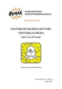 Opinnäytetyö, sekä sen tuotos Snapchat-pikaopas yritykselle, toimivat loistavana oppaana ja esimerkkinä siitä, että miten sovellusta käytetään ja mitä mahdollisuuksia sen avulla eri yritykset voivat kohderyhmänsä tuntien saavuttaa.Opinnäytetyömme tilaajana toimivat Lily.fi -blogisivusto sekä Suomen suosituin muotilehti Trendi. Tarkoituksenamme oli luoda Lilylle ja Trendille toimiva Snapchat-tili ja kouluttaa A-lehden väki Snapchatin käyttöön toukokuussa 2016. Strategian luomista varten toteutimme Lilyn käyttäjille ja Trendin lukijoille Snapchat-käyttäjäkyselyn, haastattelimme Snapchatissa menestyneitä yrityksiä sekä seurasimme liki 30:tä menestyvää Snapchat-tiliä. Luimme kirjallisuutta ja erilaisia artikkeleita siitä, miten sosiaalinen media tulee kokonaisuudessaan muuttamaan maailmaa eri organisaatioissa. Opinnäytetyön tuotoksena on konkreettinen yrityksille räätälöity Snapchat-pikaopas. Oppaassa kerromme mikä on Snapchat, miksi siellä tulisi olla sekä miten/millaista sisältöä palveluun tulee tuottaa.