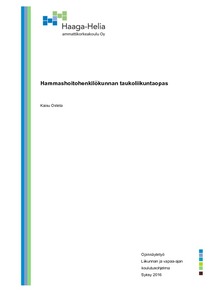 Keväällä 2016 tehtiin kysely Turun Hammaskulman hammashoitohenkilökunnalle, jonka avul-la kartoitettiin heidän tuki- ja liikuntaelinvaivojaan. Lähes jokaisella vastaajalla (n=22) oli vii-meisen 10 vuoden aikana esiintynyt yksi tai useampi tuki- ja liikuntaelinvaiva. Vastausten sekä teoriatiedon perusteella luotiin taukoliikuntaopas, joka sisältää hammashoitohenkilökun-nan työn fyysistä kuormittavuutta lieventäviä liikkeitä. Sen sisältönä on yhteensä 18 erilaista liikettä, joita on tarkoitus harjoittaa työpäivän aikana. Yksi taukoliikuntatuokio sisältää kolme liikettä ja vie aikaa noin 40 sekuntia.