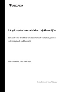 förbättra trivseln för alla på sjukhusen. Behovet av förberedande lek och material till denna typ av lek kom fram. Rummen ansågs vara små och färglösa och barnen önskade att de skulle få påverka sin miljö mer. In Finland, 20% of the children are suffering from a long-term illness, but previous studies show that there isn't enough research about children's views about the hospital environment. The hospital environment affects the child in many ways and could even inhibit the child’s development. Therefore, the purpose of this study was to examine children who suffer from long term illness and their parents’ experiences and wishes about the built hospital environment and how it promotes play.