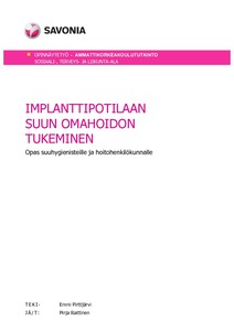 Työmme toteutettiin toiminnallisena opinnäytetyönä. Teimme digitaalisen oppaan hammasimplanttipotilaan suun omahoidon tukemisesta Keski-Suomen seututerveyskeskukselle. Oppaaseen koottiin kirjalliset ja kuvalliset ohjeet hammasimplanttipotilaan suun omahoidon tukemiseen sekä suun ylläpitohoidon toteuttamiseen suuhygienisteille ja hoitohenkilökunnalle. Näitä ohjeita apuna käyttäen suuhygienisti ohjaa hammasimplanttipotilaan suun omahoitoa työssään. Hoitohenkilökunta saa oppaasta apua hoitotyöhönsä hammasimplanttipotilaan suun hoidossa. Kuvamateriaali ja teoriatietoa kasattiin yhteistyössä Plusterveys Siltapuiston kanssa.