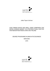Opinnäytetyön aiheena oli tutkia miten mikro- ja pienyritykset Suomessa voivat kansainvälistyä paremmin Kiinan markkinoilla. Tutkimuksessa tutustuttiin keskeisten toimijoiden julkiseen materiaaliin, sekä haastateltiin asiantuntijoita niin Kiinassa kuin Suomessakin. Tarkoituksena oli luoda pohjaa tulevaisuuden uusille tutkimuksille osoittamalla mahdollisia julkisen sektorin toimijoita molemmin puolin jotka eivät vielä olleet keskenään tehneet yhteistyötä. Lopputuloksena syntyi muutamia pareja joiden välillä aloitettiin viralliset keskustelut jo lopputyön aikana ja sieltä syntyi tuloksena myös ehdotuksia tulevaisuuden tutkimusaiheille, jotka tämän lopputyön lopussa esitellään. The purpose of this thesis was to conduct research how small and micro sized Finnish companies could establish operations in China via strategic partnerships channels from the different organisations of the public sector. The information was sought from internet and from in depth interviews with experts both in China and Finland. The thesis proved to be an excellent starting point for further research in the same field and it mapped and pointed out some key organisations from both countries who have yet to do any cooperation successfully but have a significant role in their own countries. As a result of this thesis new partnerships were made between some organisations and it also created a possibilities for future research which are presented in this thesis document.