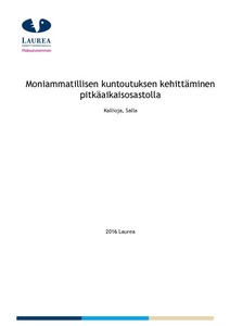 Kehittämistyön tavoitteena oli kehittää moniammatillista kuntouttavaa hoitotyötä Kustaankartanon monipuolisen palvelukeskuksen pitkäaikaisosastolla. Tarkoituksena oli arvioida säännöllisen ja kohdistetun kuntoutuksen vaikutusta asukkaiden toimintakykyyn. Vaikuttavuusarvioinnin perustana käytettiin asukkaan palvelutarpeen mittariston, RAI:n (Resident Assessment Instrument), tuloksia ja osastojen välistä vertailua. Lisäksi työssä selvitettiin hoitajien näkemyksiä kuntouttavasta hoitotyöstä sekä yhteistyöstä osaston fysioterapeutin kanssa.