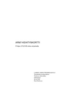 Tämän opinnäytetyön tarkoituksena oli suunnitella ja toteuttaa ARM-mikro-ohjain pohjainen kehityskortti. Kortin tuli olla soveltuva ARM-ohjelmoinnin opettamiseen. Työssä myös selvitettiin ARM-mikro-ohjaimen ohjelmointiympäristön käyttöönotto. Teoriaosassa käsitellään ARM-arkkitehtuuria, työssä käytettyjen Atmelin AT91R40008-mikro-ohjaimen sekä Philipsin LPC2105-mikro-ohjaimen ominaisuuksia. Erityisesti työssä keskitytään kehityskorttien suunnitteluun. Kehityskortin vaatimuksina oli, että se varustetaan ARM7-prosessoriytimellä, korttiin voidaan liittää ulkoinen lisälaitekortti, lisäksi kortilla tai valmiiksi suunnitellun lisäkortin avulla on mahdollista testata yksinkertaisia ohjelmia. Kortteja suunniteltiin ja valmistettiin neljä kappaletta. Ensimmäinen kortti oli Atmelin AT91R40008-mikro-ohjainkortti ja toinen kortti kyseisen kortin testaamista varten suunniteltu emokortti. Kolmas kortti suunniteltiin Philipsin LPC2105-mikro-ohjaimen ISP-liitynnän testaamista varten ja neljäs kortti oli lopullinen LPC2105-mikro-ohjaimella toteutettu kehityskortti. Lopulliselle LPC2105-mikro-ohjainkortille tehtiin kaksi ohjelmaa sarjaliikenteen sekä IO-pinnien testaamista varten. Ohjelmointiin käytettiin ilmaista WinARM-ohjelmointityökalukokoelmaa. Kehityskortti onnistui vaatimusten mukaisesti. Samalla tuli esille, ettei ARM-mikro-ohjaimen käyttöönotto vaadi välttämättä sen enempää piirikortilta kuin AVR-mikro-ohjain, jota on ennen käytetty yleisesti laiteläheisen ohjelmoinnin opettamiseen. Lisäksi Philipsin LPC21xx-sarjan mikro-ohjaimille löytyy toimivat ilmaiset ohjelmointityökalut.