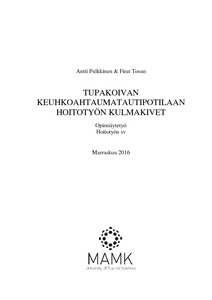 Tämän opinnäytetyön tarkoituksena on tehdä kirjallisuuskatsaus tupakoivien keuhkoahtaumatautipotilaiden hoitotyön kulmakivistä. Opinnäytetyön tavoitteena on lukijan tiedon lisääminen tupakoinnin aiheuttamasta keuhkoahtaumataudista sekä sen tärkeimmistä hoidon kulmakivistä Lisäksi olemme tehneet ope-tusmateriaaliksi posterin Mikkelin ammattikorkeakoulun terveysalan laitokselle.