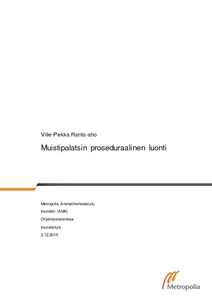 Työssä esitellään muistipalatsi-niminen muististrategia ja prototyyppi ohjelmasta, jota voidaan hyödyntää muististrategiaa käyttäessä. Ohjelma luo proseduraalisesti asuntoja, joissa muistaja voi liikkua FPS-pelin tavoin. Asuntojen pohjapiirustukset ovat satunnaisesti luotuja, joten käyttäjän ei tarvitse suunnitella asuntoja.