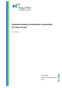 Tämän opinnäytetyön tavoitteena on selvittää Kb Yritys X Ky:n vastuunalaisille yhtiömiehille, miten heidän kommandiittiyhtiössä voidaan toteuttaa sukupolvenvaihdos, mikä on vaihdoksen hinta ja millainen on sukupolvenvaihdoksesta aiheutuva yhtiömiesten verotuskohtelu. Opinnäytetyö keskittyi kommandiittiyhtiön yhtiöosuuden luovutuksen vaihtoehtoihin ja tavoitteena oli löytää oikeanlainen ja – suuruinen vaihtoehto yrityskaupan, lahjan ja lahjanluonteisenkaupan väliltä.