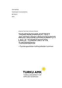 Akustikusneurinooma on kuulohermokasvain, joka häiritsee vestibulaarijärjestelmän toimintaa aiheuttaen tasapaino-ongelmia. Kehittämistyön tarkoituksena oli akustikusneurinoomapotilaiden arkielämästä selviytymisen helpottaminen, ja tavoitteena oli luoda akustikusneurinoomapotilaille tuotoksena kotiharjoiteohjeet, joilla pyritään vaikuttamaan sairauden aiheuttamiin tasapaino-ongelmiin. Tuotos sisältää kolme osiota, joissa jokaisessa harjoitteet koostuvat akustikusneurinoomaa sairastaville tyypillisistä arjessa esiintyvistä tasapaino-ongelmista.