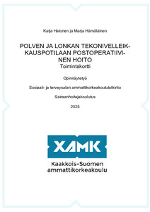 (2025)Tekonivelleikkaus auttaa potilaita, joilla on vaikea-asteinen nivelrikko. Tämä opinnäytetyö kertoo näiden potilaiden postoperatiivisesta hoidosta osastolla ja on suunnattu hoitajille, jotka hoitavat polven ja lonkan ... -