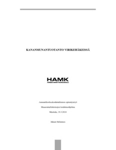 Opinnäytetyön tarkoituksena on tutustua kananmunantuotantoon virikehäkeissä eli pienryhmäkanalassa. Toimeksiantaja on kananmunantuotantotila Huittisista. Tavoitteena työssä on selvittää, mikä virikehäkki on ja vertailla sitä muihin kananmunantuotantotapoihin. Työn tarkoituksena on lisäksi selvittää virikehäkkien hyvät ja huonot puolet sekä selkeimmät erot verrattaessa niitä vanhoihin perinteisiin häkkeihin.