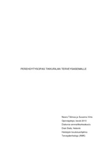 Opinnäytetyön tavoitteena oli tuottaa perehdytysopas ja perehdytyksen seurantalomake uusille työntekijöille, työhön palaajille, opiskelijoille ja nykyisille työntekijöille. Opinnäytetyön yhteistyötahona oli Tikkurilan terveysasema. Perehdytysoppaan ja perehdytyksen seurantalomakkeen tarkoituksena oli helpottaa työntekijän perehdytystä ja antaa perustiedot terveysaseman työskentelystä.