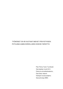 Opinnäytetyö toteutettiin Helsingin kaupungin terveyskeskuksen tilaustyönä. Se on lisäselvitys aikaisempaan ilmestyneeseen tutkimukseen Päivystyspotilaan kiireellisyysryhmittely vuodelta 2008, jonka tulosten perusteella rajasimme teemoittain ryhmät, joiden perusteella etsimme aikaisempia tutkimustuloksia. Rajatut teemat vastasivat kysymykseen, miksi työikäiset 35–55-vuotiaat miehet hakeutuvat päivystykseen ilman kiireellisen hoidon tarvetta. Tutkimusmetodina käytettiin kirjallisuuskatsausta. Aineisto analysoitiin sisällön analyysillä.