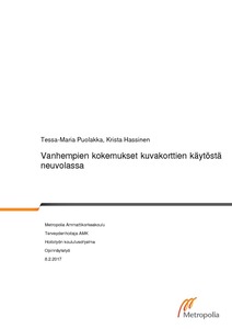 Opinnäytetyön tarkoituksena oli kartoittaa vanhempien kokemuksia kuvakorttien käytöstä äitiys- ja lastenneuvolassa. Tavoitteena oli tuottaa tietoa Turvallisin mielin -hankkeelle tietyissä Uudenmaan kuntien äitiys- ja lastenneuvoloissa pilottikäytössä olleiden Turvallisin mielin vanhemmaksi -kuvakorttien käytöstä, niiden hyödynnettävyydestä ja kehittämistarpeista.