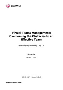 The main purpose of this thesis was to introduce virtual teams as an alternative to traditional workforce, as well as to demonstrate its advantages from both employees’ and companies’ perspective. The research was based on the case company Blooming Twig, which is 100% virtual. The aim of this research was to identify the most common challenges associated with remote work and to provide guidelines for overcoming these challenges in order to build an efficient and productive team.