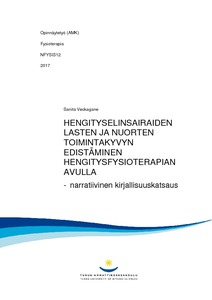 Tämän opinnäytetyön tavoitteena oli selvittää kirjallisuuskatsauksen kautta miten hengitysfysioterapian avulla voidaan edistää hengityselinsairaiden lasten ja nuorten toimintakykyä. Opinnäytetyön tutkimusmenetelmänä toimi narratiivinen kirjallisuuskatsaus. Tutkimusaineisto muodostui kirjallisuuskatsauksen jälkeen 10 tutkimuksesta. Käytetyt sähköiset tietokannat olivat PubMed ja Cochrane. Tutkimusaineisto koostui pääosin vuoden 2010–2016 tehdyistä tutkimuksista.