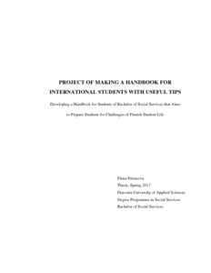 Petrasova, Elena. Project of making a handbook for international students with useful tips: Developing a Handbook for Students of Bachelor of Social Services that Aims to Prepare Students for Challenges of Finnish Student Life. A product thesis. 29 pages. Language: English. Diaconia University of Applied Sciences, Degree Program in Social Services, Bachelor in Social Services. Autumn 2017.