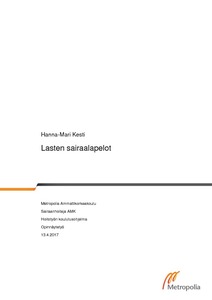 Opinnäytetyön tarkoituksena oli kuvata mitä ovat leikki-ikäisten 4-6-vuotiaiden lasten pelot sairaalassa, sekä miten sairaalapelkoja lievitetään. Tavoitteena oli hankkia tietoa lasten hoidon kehittämiseen ja hoitohenkilökunnan ja opiskelijoiden tiedon lisäämiseen sairaalapeloista.