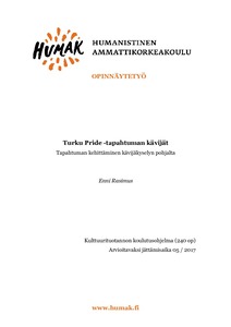 Opinnäytetyöni käsittelee vuonna 2014 ensimmäistä kertaa ja sen jälkeen vuosittain järjestettyä Turku Pride -tapahtumaa ja sen kehittämistä vuonna 2016 tehdyn kävijäkyselyn pohjalta. Tämän työn lähtökohtana oli se, ettei tapahtumalle oltu tehty minkäänlaista kehitystyötä tai kävijätutkimusta aiemmin. Tapahtumaa on aiemmin järjestetty vuosittain vaihtuvan työryhmän voimin ja vuonna 2016 ensimmäistä kertaa koordinaattorin ohjaamana. Jonkinlaiselle kartoitukselle oli siis tarvetta, sillä tapahtumaan liittyvä kritiikki oli monessa tapauksessa ristiriitaista ja tapahtuman kehittymisen edellytyksenä on onnistumisien ja epäonnistumisien tiedostaminen.
