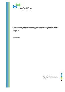 Tämä opinnäytetyö on toteutettu tutkimuksen toimeksiantajalle, Yritykselle syksyllä 2016. Tutkimuksen tavoitteena on kehittää Yrityksen Suomen organisaation valmentavaa johtamista. Työ koostuu tietoperustasta sekä empiirisestä osiosta. Tietoperustassa käsitellään myyn-nin esimiestyöhön ja valmentavaan johtamiseen sisältyviä osa-alueita. Tietoperustan lopuksi teoriasta tehdään yhteenveto, jossa määritellään itse tutkimuksen otsikko, valmentava johtaminen myynnin esimiestyössä. Empiirisessä osiossa esitetään tutkimuksen tulokset, johtopäätökset sekä jatkotutkimusehdotukset.