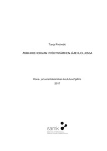 Opinnäytetyön aiheena oli tutkia miten aurinkoenergiaa hyödynnetään tällä hetkellä jätehuollossa Suomessa sekä ulkomailla. Lisäksi tavoitteena oli suunnitella aurinkoenergialla toimiva puristimellinen jätesäiliö, jota voitaisiin käyttää esimerkiksi Porin Tikkulan yleisessä jätekierrätyspisteessä kotitalouksissa syntyvän muovijätteen keräämiseen. Tutkimuksen osaongelmia olivat selvittää 1) miten olemassa olevia ratkaisuja voisi hyödyntää Suomen olosuhteissa talviolosuhteet huomioiden ja 2) miten estetiikan voisi ottaa huomioon jätehuoltoratkaisuissa.