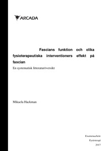 Fasciabehandlingar är ett relativt nytt område inom fysioterapin, även om intresse för ämnet funnits redan under antikens tid. Forskningsmetoderna har i dag blivit bättre och vi kan undersöka vävnader som varit omöjliga att undersöka tidigare, på grund av tek-nikbrist. Syftet med det här arbetet är att ta reda på vad forskningen idag kommit fram till i fråga om fascia, ffa då det handlar om smärta, och hur fysioterapeuten kan ha nytta av kunskapen vid behandling av klienter. Den första forskningsfrågan är vilka metoder en fysioterapeut kan rekommenderas använda för behandling av fascian. Skribenten vill också ta reda på vilken fasciabehandling är mest effektiv för att lindra smärta. Arbetet är gjort som en systematisk litteraturöversikt enligt Forsberg & Wengströms (2003) modell. 14 artiklar har inkluderats om än artiklar av hög kvalitet varit svåra att finna. För att be-svara frågorna har databassökningar gjorts i databaserna ScienceDirect, EBSCO, Google Scholar och Research Gate. Tidskriften Journal of Bodywork and Movement Therapy har också använts som en källa. Resultatet har analyserats i olika kategorier: smärta, olika interventioner, mätning av fascian, påverkan på rörelseomfång och idrotts-prestationer. Resultatet indikerar på att olika interventioner, såsom myofascial release och foamrolling kan påverka smärta, men de bästa resultaten fås via kombination av olika metoder. En tjockare fascia indikerar på smärta, och fascians inskränkta glidrörelse ses hos patienter med ländryggs smärtor. Kunskap om fasciabehandlingar ger fysiotera-peuten ett extra redskap vid behandling av smärtpatienter, även ömhet efter idrottspre-stationer verkar kunna lindras och rörelseomfång förbättras.