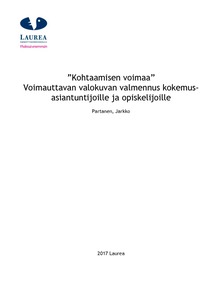 Opinnäytetyö toteutettiin toiminnallisena opinnäytetyönä, jonka konkreettinen produkti oli Voimauttava valokuva –valmennus kokonaisuus osana yhteisvalmennusta. Opinnäytetyön toimeksiantajana toimi Laurea ammattikorkeakoulun Otaniemen yksikkö, ja ”Samassa veneessä – kokemuksen äärellä” valmennuksen valmentajaryhmä.
