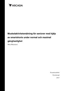 Tämä opinnäytetyö on osa laajempaa Arcadan tekemää tutkimusta liittyen älyshortseihin. Arcadan tutkimuksen tavoitteena on selvittää/tutkia älyshortseja käyttäen Timed Up & GO (TUG) testin tuloksiin vaikuttavia tekijöitä. Testillä mitataan iäkkäiden liikkumiskykyä sekä tasapainoa. Tutkimukseni käsittelee lihastoiminnan ja kävelynopeuden yhteyttä antaen siitä tietoa tutkimuskokonaisuuteen.Tilastojen mukaan suomalaisten keskuudessa tapahtuu vuosittain noin 400 000 kaatumisonnettomuutta ja vuosittain joka kolmas 65 vuotta täyttänyt sekä joka toinen 80- vuotta täyttänyt kaatuu. Aikaisempien tutkimusten mukaan suurimmat kaatumisonnettomuuksien riskitekijät ovat lihasheikkous sekä tasapaino- ja kävelyvaikeudet. Tämän tutkimuksen tarkoituksena on selvittää miten senioreiden/iäkkäiden lihasaktiivisuus korreloi kävelynopeuden kanssa normaalilla ja maksimaalisella kävelynopeudella 10-metrin matkalla. Tutkimuksessa käytetään älyshortseja, jotka mittaavat lihasaktiivisuutta (EMG) pintaelektrodeilla quadriceps- ja hamstringslihaksissa. Tutkimuksen kysymyksenasettelu on seuraava: Mitä lihasaktiivisuudelle tapahtuu kävelynopeuden lisääntyessä? Mikä on quadriceps- ja hamstringslihasten lihasaktiviteetin suhde normaalin kävelynopeuden aikana verrattuna maksimaaliseen kävelynopeuteen? Tutkimuksen menetelmä on kvantitatiivinen.Tutkimukseen osallistui 29 koehenkilöa.Tulokset analysoitiin Pearsonin korrelaatiokertoimen avulla. Tutkimustulokset osoittavat, että lihasaktiivisuuden ja kävelyvauhdin välillä on korrelaatio (r=0,671, p<0,01) . Tarvitaan lisää kohderyhmiä ja tutkimuksia, jotta voidaan verrata tuloksia keskenään ja saada kattavampia tuloksia. Tulevaisuudessa älyvaateteknologia voi olla luotettava ja hyödyllinen menetelmä fyysisen aktiivisuuden mittaamiseen sekä kuntoutuksen arviointiin terveillä henkilöillä ja henkilöillä, joilla on toiminnanvajeita.