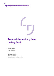 (2025)Tässä opinnäytetyössä selvitettiin, mitä traumainformoitu työote tarkoittaa, kun sitä hyödynnetään hoitotyössä. Toiminnallisessa opinnäytetyössä tuotettiin oppimateriaali traumainformoidusta työotteesta hoitotyössä terveysalan ... -