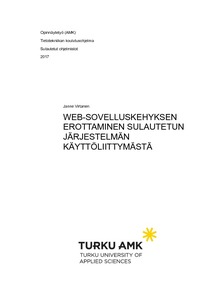 Tämän opinnäytetyön tutkimusosassa perehdyttiin sovelluskehyksiin ja joihinkin yleisiin web-arkkitehtuurien suunnittelumalleihin. Työn käytännön osassa toimeksiantajalle luotiin web-sovelluskehys. Kehystä ei kuitenkaan tehty alusta lähtien, vaan se erotettiin olemasta olevasta sulautetun järjestelmän käyttöliittymästä. Tutkimuksesta saatua tietoa sovellettiin käyttöliittymän arkkitehtuurin analyysissa, minkä jälkeen erotustyö suunniteltiin ja toteutettiin onnistuneesti. Suuria muutoksia arkkitehtuuriin ei lopulta tehty, mutta pienempiä parannuksia toteutettiin sovellusytimeen, istunnonhallintaan ja alustukseen. Uutena komponenttina kehykseen luotiin käännösohjelma, jolla kehys ja sovellus voidaan yhdistää. Kehykseen luotiin lisäksi testipalvelin käyttöliittymien testaamiseen.