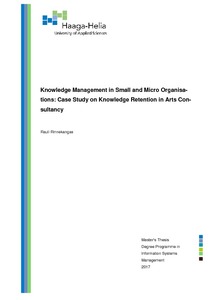 In this thesis, the knowledge management in small organisations will be examined. As a case example on examining and developing knowledge management in a small, micro-sized organisation, an arts consultancy business run by one person was selected for in-depth study and development focus. The case example is reflected according to existing knowledge management research and related frameworks for conducting transfer of tacit-oriented knowledge of the organisation in organizational transition scenarios: in particular, transforming tacit knowledge into easily transferable explicit forms will be examined while taking the overall resource-constrained nature of the organisation into consideration. The use of recording mediums combined with modern information technology (IT) for the purpose will be examined and their usability as solution options for the case in respect to its specifics will be outlined in detail. The final outcomes of the study include a development plan which proposes measures for knowledge management activities required for knowledge retention in the case organisation, as well as insights on how knowledge management can be applied in cases similar to the example organisation: other small organisations may find the applied methodologies as well as their results useful in analysing knowledge management specifics of organisation, extracting and defining related requirements, and accordingly determining knowledge management actions in organisation for further development.