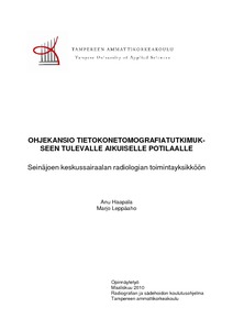 Opinnäytetyön tavoitteena oli luoda aikuiselle potilaalle ohjekansio, joka antaa tietoa tietokonetomografiatutkimuksista. Näin pyritään auttamaan potilasta valmistautumaan tutkimukseen sekä lisäämään hänen turvallisuuden tunnettaan tutkimuksen aikana. Tarkoituksena oli tuottaa ohjekansio Seinäjoen keskussairaalan radiologian toimintayksikön odotustilaan tietokonetomografiatutkimukseen tulevalle aikuiselle potilaalle. Opinnäytetyön tehtäväksi muodostui: Millainen on potilasopas tietokonetomografiatutkimukseen tulevalle aikuiselle potilaalle?