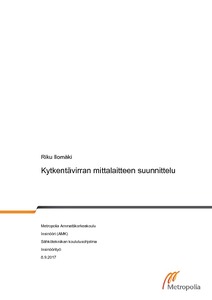 Tämä raportti käsittelee Teknoware Oy:lle opinnäytetyönä tehtyä kytkentävirran mittalaitteen suunnittelutyötä. Mittalaite on suunniteltu käytettäväksi Teknoware Oy:n ajoneuvo-elektroniikan tuotekehityksen suunnitteluntodennustesteissä. Raportti sisältää lyhyen katsauksen kytkentävirtaan ilmiönä, piirikaavion ja piirilevyn suunnittelutyön ja prototyypin testauksen selostukset.