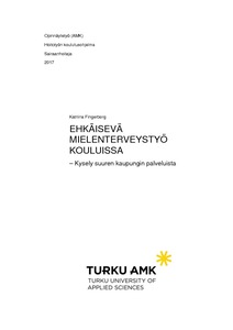 Tämän opinnäytetyön tarkoitus on kuvailla yläkoulujen tarjoamat ehkäisevät mielenterveyspalvelut, selvittää yhden suomalaisen kaupungin yläkouluissa tarjottavat palvelut sekä lisäksi selvittää palveluiden tarvetta. Opinnäytetyön yhtenä menetelmänä käytettiin laadullista tutkimusmenetelmää. Tutkimusaineistoa kerättiin strukturoidun kyselylomakkeen avulla. Aineistoa kerättiin 9.2.-21.3.2017 välisenä aikana erään kaupungin yläkoulujen terveydenhoitajilta. Kaupungin nimeä ei tässä työssä ole lupaa julkaista.