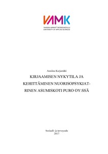 Opinnäytetyön lähtökohtana oli tutkijan kiinnostus valtakunnallisesti ajankohtai-seen sosiaalialan kirjaamisen käytäntöjen uudistamiseen ja yhtenäistämiseen asiakastyön laadun parantamiseksi. Opinnäytetyössä tutkittiin, millainen on tutkijan edustaman Nuorisopsykiatrisen asumiskoti Puro Oy:n kirjaamisen tila, mitkä ovat Nuorisopsykiatrisen asumiskoti Puro Oy:n kirjaamisen keskeisimmät kehittämis- kohteet ja millaisiin toimenpiteisiin tulisi ryhtyä Nuorisopsykiatrisen asumiskoti Puro Oy:n kirjaamisen kehittämiseksi. Tutkimuksen tavoitteena oli esittää voi- massa olevan lainsäädännön asettamia vaatimuksia lastensuojelun sijaishuoltotyön kirjaamiselle, tunnistaa sijaishuollon ammatillisen ja ajantasaisen kirjaamisen tavoitteita ja tuoda esiin sosiaalialan hyvän kirjaamisen tunnusmerkkejä.