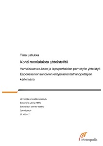 Opinnäytetyön tarkoituksena oli tarkastella monialaisen yhteistyön toteutumista Espoon kaupungilla suomenkielisen varhaiskasvatuksen ja lapsiperheiden perhetyön välillä konsultoivien erityislastentarhanopettajien näkökulmasta. Opinnäytetyössä etsittiin vastauksia siihen, millaista monialaista yhteistyötä varhaiskasvatuksen ja lapsiperheiden perhetyön välillä on tehty ja millaisia kehittämistarpeita käytännön työstä on noussut monialaiseen yhteistyöhön liittyen varhaiskasvatuksen näkökulmasta.