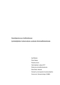 Miskala, Ilja; Saksa, Pauli & Uurto, Pauliina. Itseohjautuvuus kotihoidossa: työntekijöiden kokemuksia uudesta tiimimallista. Diak, Helsinki. Syksy 2017. Sivut 86., 5 liitettä. Diakonia-ammattikorkeakoulu, Johtamisen ja yhteiskunnallisesti vaikuttavan palvelutuotannon kehittäminen, sosionomi ja sairaanhoitaja (YAMK).