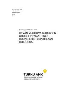 Opinnäytetyön aiheena on potilaan ja hoitajien välinen vuorovaikutus suljetuilla psykiatrisilla osastoilla tapahtuvissa eristämistilanteissa. Tarkoituksena on kuvata potilaiden ja hoitajien välistä vuorovaikutusta potilaiden näkökulmasta sekä tutkia vuorovaikutuksen merkitystä hoitajien työturvallisuuteen eristämistilanteissa. Opinnäytetyö toimii taustatutkimuksena työsuojelurahaston rahoittamalle EriTurva-hankkeelle. Hankkeen yhtenä päätavoitteista on edistää hoitajien työturvallisuutta psykiatrisissa sairaaloissa. Opinnäytetyön toteutimme toiminnallisena opinnäytetyönä, joten se sisältää sekä teoreettisen osuuden että toiminnallisena tuotoksena tehdyn opasvihon. Oppaan tavoitteena on antaa uusia näkökulmia vuorovaikutuksen keinoista työturvallisuuden parantamiseksi. Opasvihko on suunnattu suljetuilla osastoilla työskentelevien psykiatristen hoitajien käyttöön.