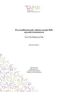 Tämä opinnäytetyön tutkimus käsittelee case-yritys Ote Ratkaisut Osk:n yritystoiminnan kautta, miten myyjän persoonallisuustyyppi vaikuttaa B2B-myynnin toteutumiseen. Tarkoituksena oli selvittää, minkälaisia luontaisia taipumuksia eri henkilöillä on ja miten ne vaikuttavat heidän B2B-myyntityökokemuksiinsa. Analysoitiin, minkälaista tukea, apua tai ohjausta B2B-myynnissä eri persoonallisuutta edustavat henkilöt kokivat tarvitsevansa ja miten tuloksia voitaisiin hyödyntää myyjien kehittämisessä heidän persoonallisuustyyppinsä avulla. Tutkimuksessa selvitettiin, miten eri persoonallisuustyypit toimivat B2B-myyntiprosessin eri vaiheissa. Tutkimus toteutetaan tapaustutkimuksena teemahaastatteluiden avulla. Persoonallisuusteoriana käytettiin Myers-Briggs tyyppi-indikaattoria, joka on yksi maailman suosituimmista persoonallisuuden määrittäjistä.