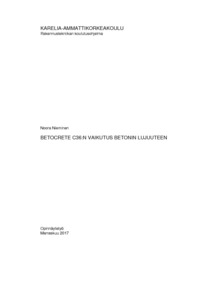 Tässä opinnäytetyössä tutkittiin betonin lisäaineen nimeltä Betocrete C36 vaikutusta betonin lujuuskehitykseen. Työ toteutettiin Pielisen Betoni Oy:n toimeksiannosta ja kyseistä ainetta käytettiin Joensuun toriparkin betonissa takaamassa rakenteelle vaadittu vesitiiviys. Betocrete C36-aineen jälleenmyyjä Suomessa on Semtu Oy.