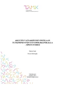 Opinnäytetyön tavoitteena oli lisätä hoitotyön opiskelijoiden osaamista akuutin vatsakipuisen potilaan tutkimisessa päivystyspoliklinikalla. Opinnäytetyön tarkoituksena oli tuottaa Tampereen ammattikorkeakoulun käyttöön opetusvideo, jonka aiheena oli akuutin vatsakipuisen potilaan tutkiminen päivystyspoliklinikalla. Opinnäytetyön tehtävänä oli selvittää, mitä akuutti vatsakipu on, kuinka potilasta haastatellaan ja tutkitaan sekä miten hoitaja voi tunnistaa kiireellisintä hoitoa vaativat potilaat.